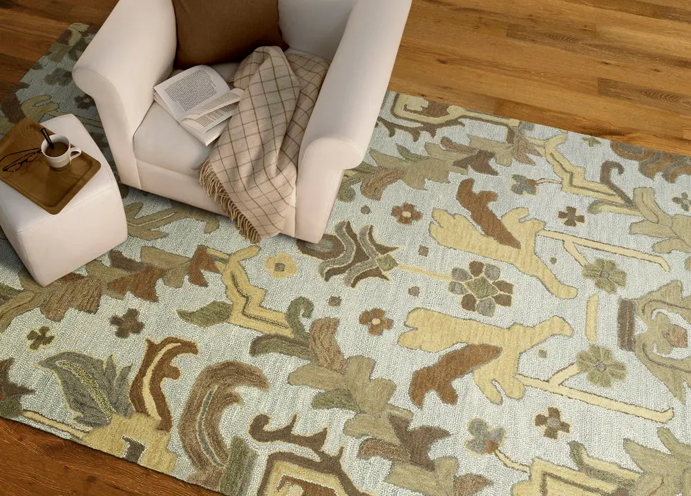 Brooklyn 5311-77 Rug: The specific colors of this rug include Silver, Light Camel, Camel, Mushroom, Jade, Blue Grey.