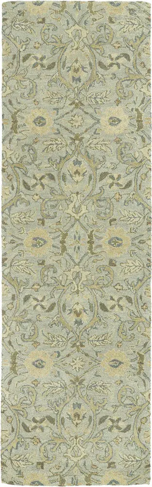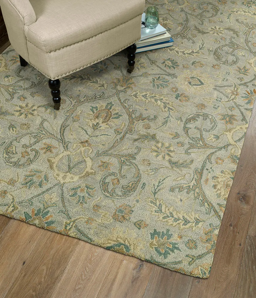 Helena 3200-77 Rug: The specific colors of this rug include Light Blue Grey Background, Light Gold, Beige, Sage, Olive, Greyish Teal.