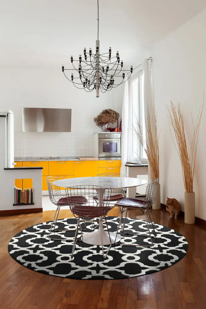 Looking for a new area rug for your dining room? A great tip is to pull out the dining room chairs as if you were sitting at the table and measure the floor space being taken up by both the table and chairs. That way you will have the perfect size area rug for your dining room set, and not have to worry about the chairs slipping off the rug when guest scoot their seat out.