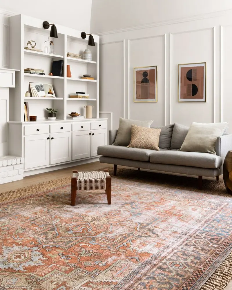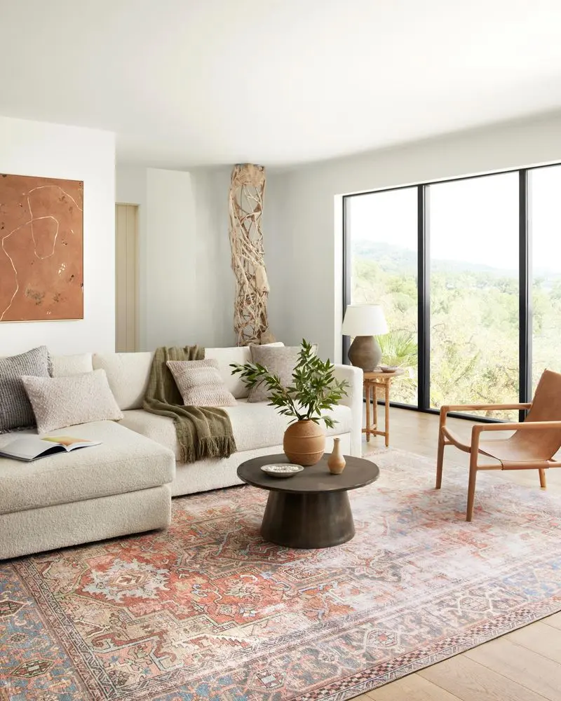 Looking for a new area rug for your great room or living room? Keep in mind that the area rug should fit slightly under the front of the sofa, and allow your guests to walk around your coffee table comfortably (typically a 2’ to 3’ space around the coffee table works).