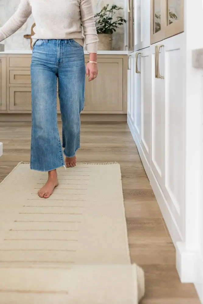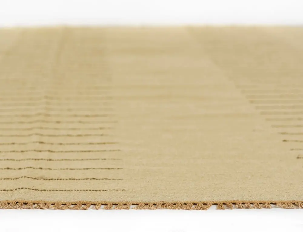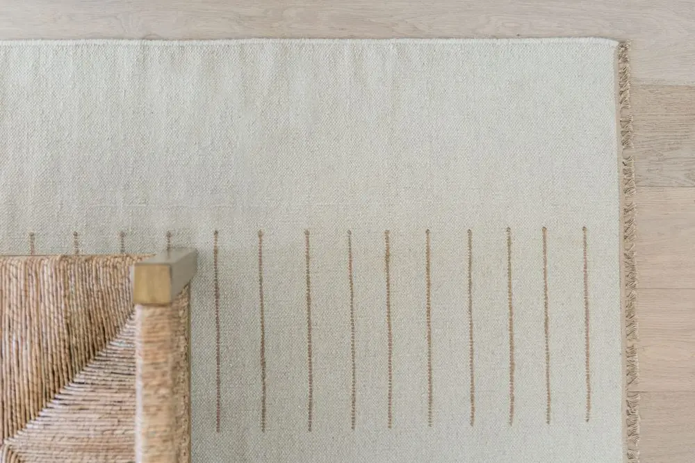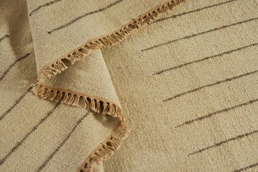 Enjoy the look of history with the durability of new fibers, the Corfu Collection features both. A wool flatweave topped with a simple hand-woven stitching technique adds just the right amount of detail to ground a space. The neutral ivory and antiqued color palette fits in with many different aesthetics and works well as a layering piece.