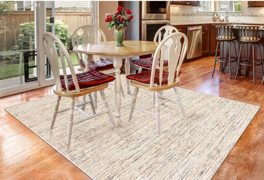 Looking for a new area rug for your dining room? A great tip is to pull out the dining room chairs as if you were sitting at the table and measure the floor space being taken up by both the table and chairs. That way you will have the perfect size area rug for your dining room set, and not have to worry about the chairs slipping off the rug when guest scoot their seat out.